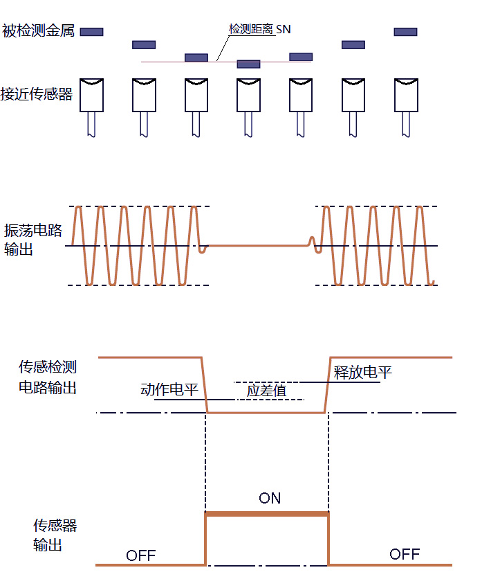 振蕩電路中的電磁線圈 L 產(chǎn)生一個(gè)高頻磁場(chǎng)。被檢測(cè)金屬接近電磁線圈磁場(chǎng)時(shí),由于電磁感應(yīng)原理在被測(cè)金屬中就有一個(gè)感應(yīng)電流 (渦電流)流動(dòng)。隨著被測(cè)金屬靠近傳感器,感應(yīng)電流增強(qiáng),引起振蕩電路中的負(fù)載加大,振蕩減弱或停止。傳感器利用振幅檢測(cè)電路檢測(cè)到振蕩狀態(tài)的變化并輸出檢測(cè)信號(hào)。 振幅變化的程度隨被測(cè)金屬的種類而不同,因此檢測(cè)距離也隨被測(cè)金屬的種類而不同。 深圳市多凱科技有限公司專注接近開關(guān).接近傳感器,光電開關(guān). 光電傳感器的開發(fā)和生產(chǎn) 多凱官方網(wǎng)站: http://m.zhec-zjhd.com.cn/ |